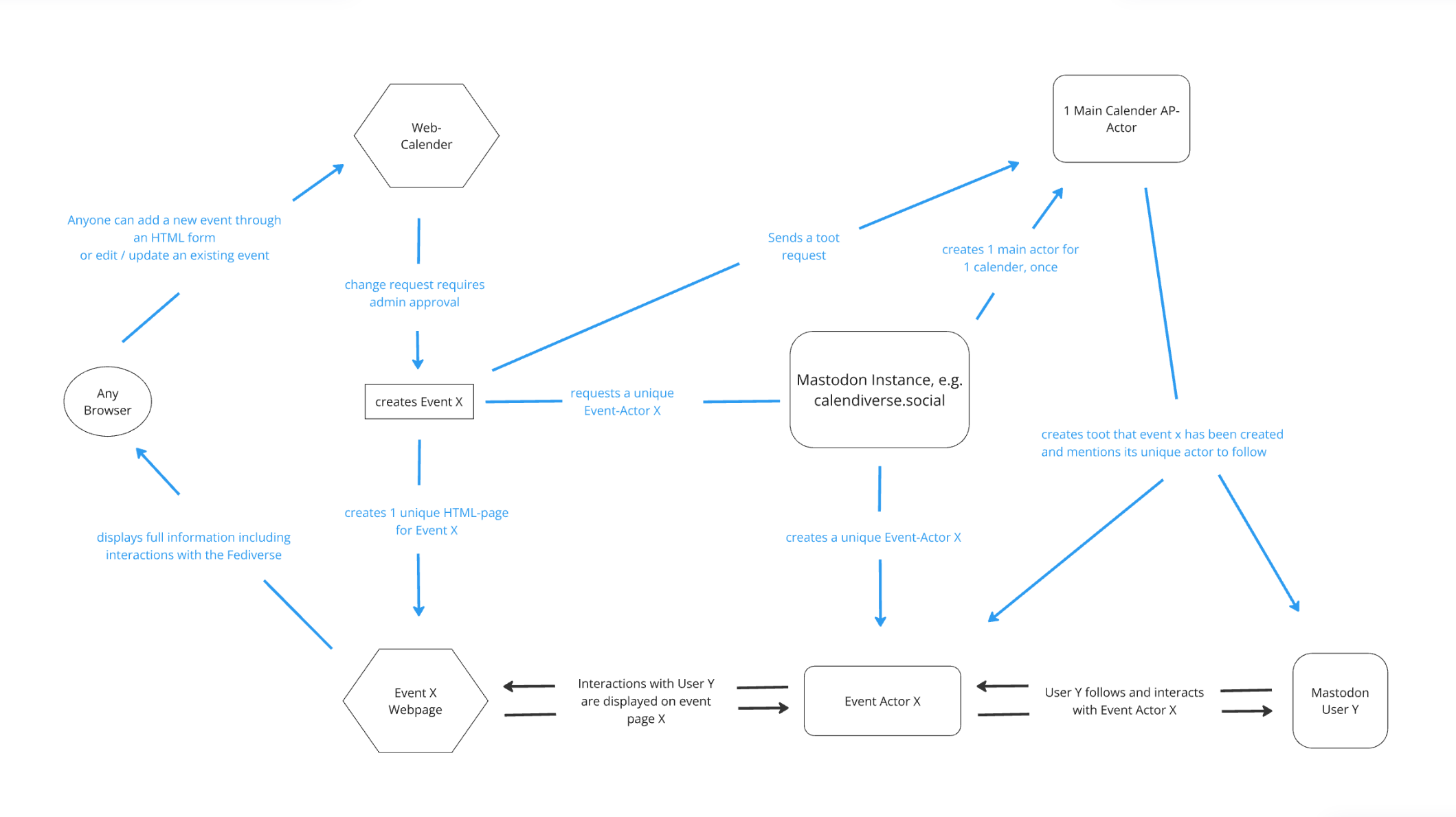 To this end, each event in the Calendiverse consists of a perma-URL and a unique ActivityPub actor (an "event actor"). Initially, this will be a Mastodon account, but it is planned that this will be opened up to include any Fediverse account in future developments. Said event actor acts as a bot, automatically tooting and re-tooting certain information. On the other hand this event actor provides interaction opportunities for all users with a Fediverse account (again, focusing on Mastodon integration initially).