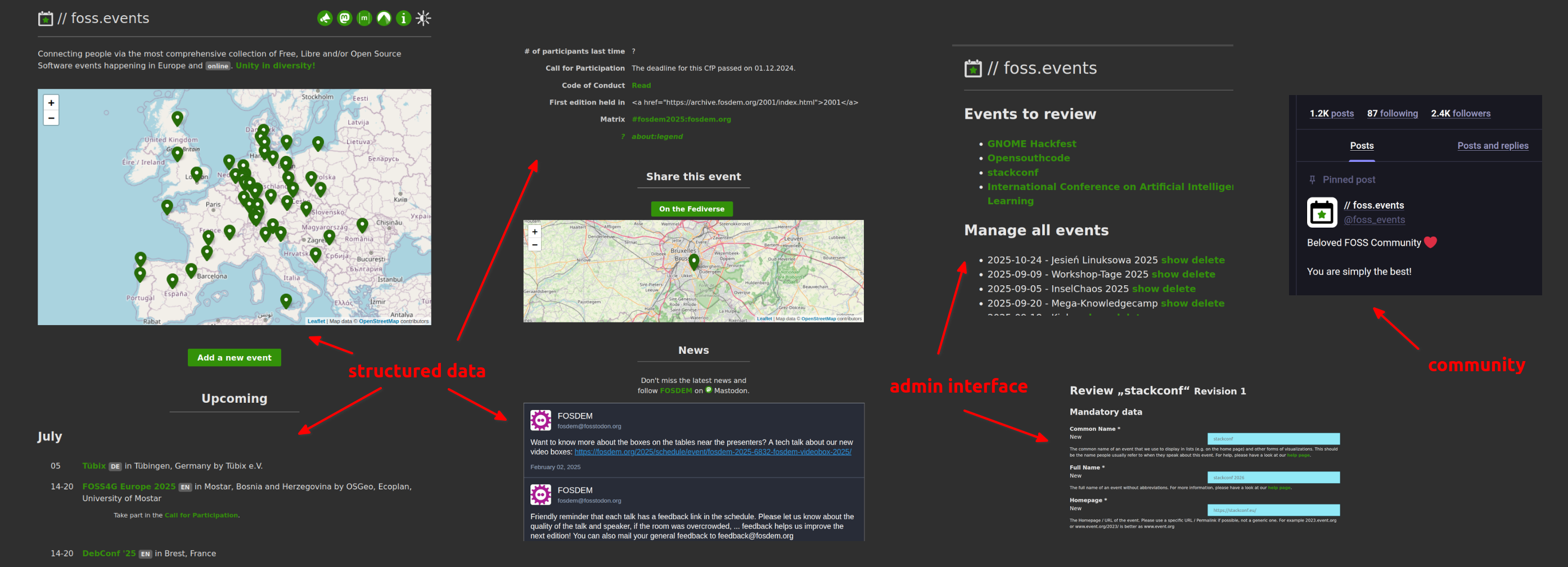 It already includes many core features, particularly the wiki-like experience with structured data and admin interfaces, which will be further developed for the Calendiverse application as a whole. What's more, //foss.events comes with a vibrant community that is already interacting with the calendar by adding and editing events, and maintaining a shared calendar. This means that there is already a target group and community eager to test and provide feedback on any feature enhancements during the development of Calendiverse.