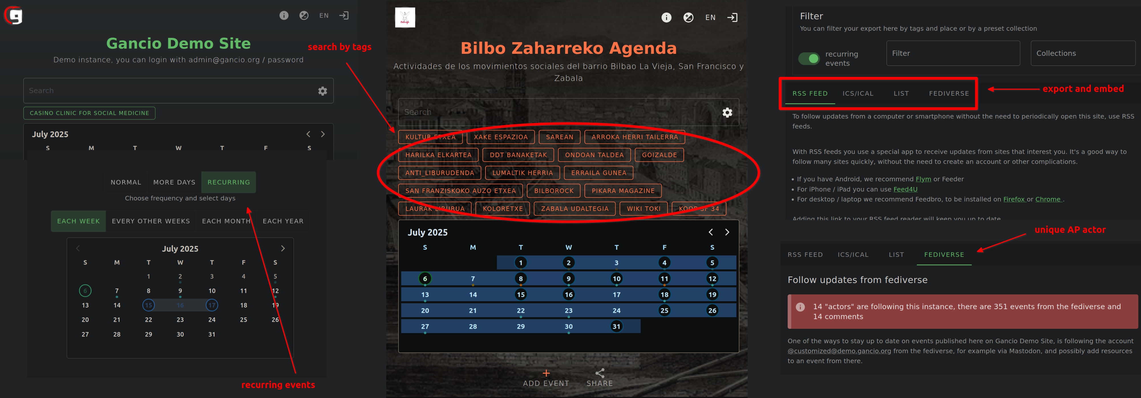 When it comes to UX, Gancio is amazing and full of features! It is well documented and has features such as recurring events and embedding. It can export events in many ways, including via RSS feeds and global or individual ICS. This allows you to embed a list of events or a single event via an iframe or web component on other websites. It can also export events via ActivityPub, microdata and microformat. Last but not least, Gancio comes with an integrated feature to filter events based on tags or probably other properties, that is a UX-must to be integrated in the Calendiverse as well.