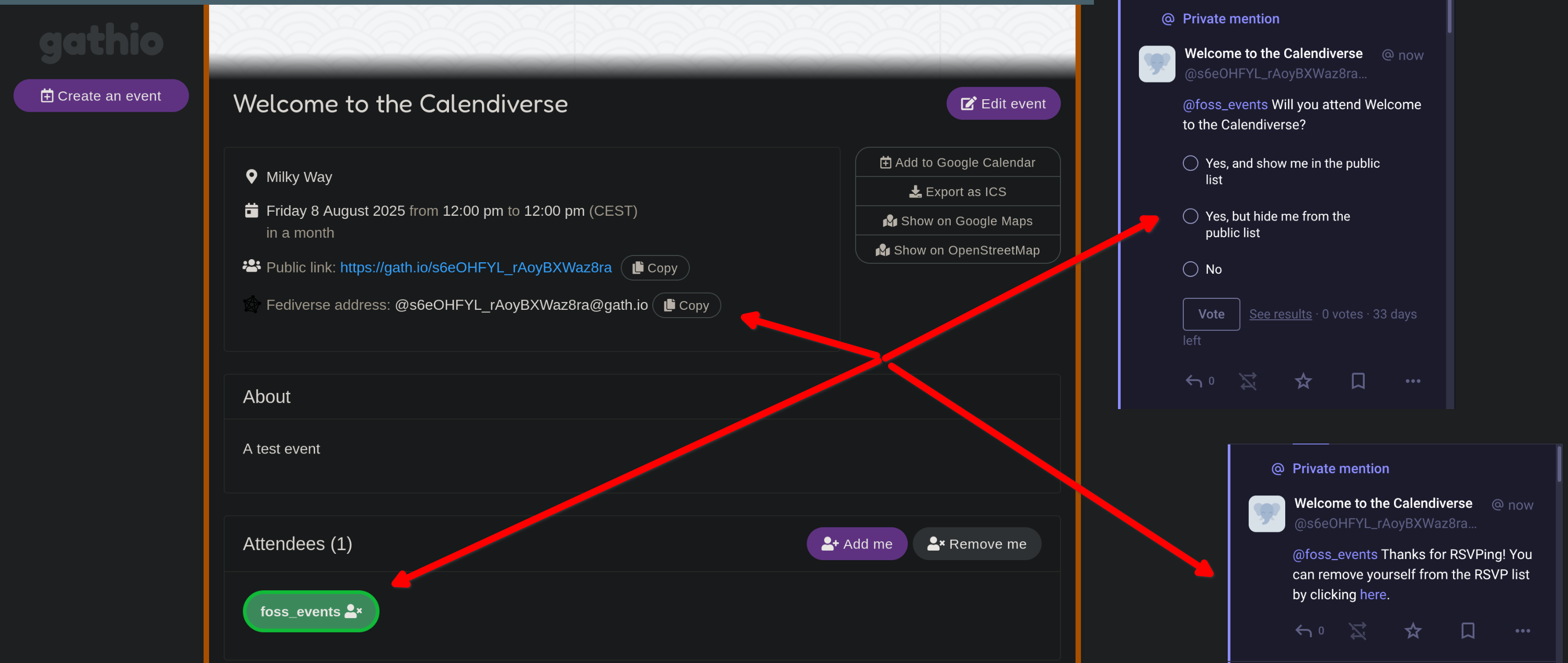 The core concept of Calendiverse's RSVP integration via ActivityPub will be based on features from gath.io. Gath.io already has a functioning concept of how people can indicate their attendance at an event using their own Mastodon account, and interact with other Mastodon accounts.